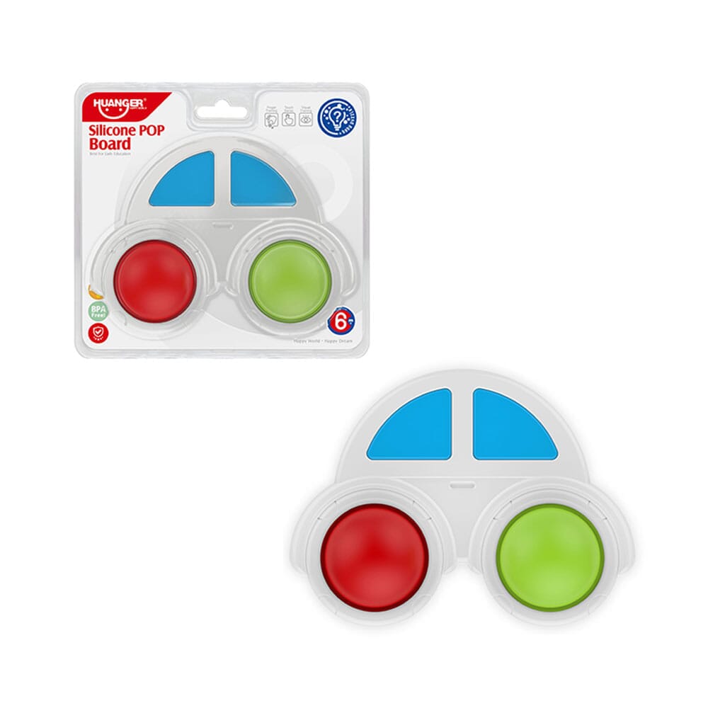 Un tablero pop-it de silicona en forma de automóvil que proporciona estimulación visual y táctil y aprendizaje de colores.