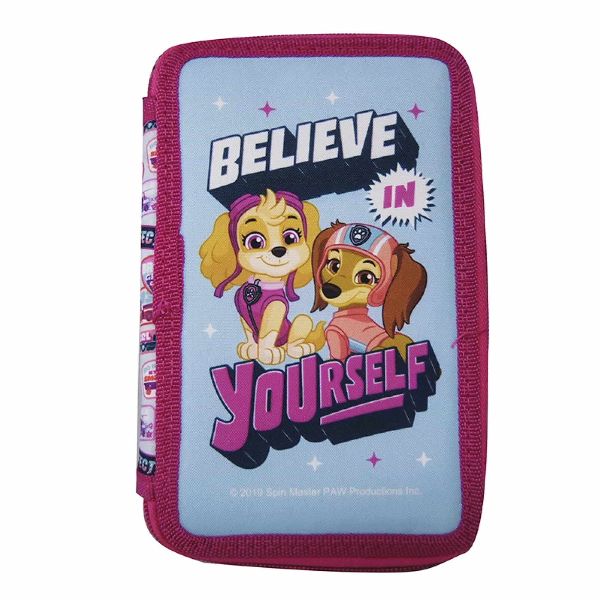 Cartuchera infantil con diseño de Paw Patrol, es de 3 pisos de alto. Mide 13 cm ancho x 20 cm largo x 6 cm espesor. Dentro tiene espacios para colocar los útiles escolares. El cierre cubre toda la apertura de la cartuchera. Producto oficial.