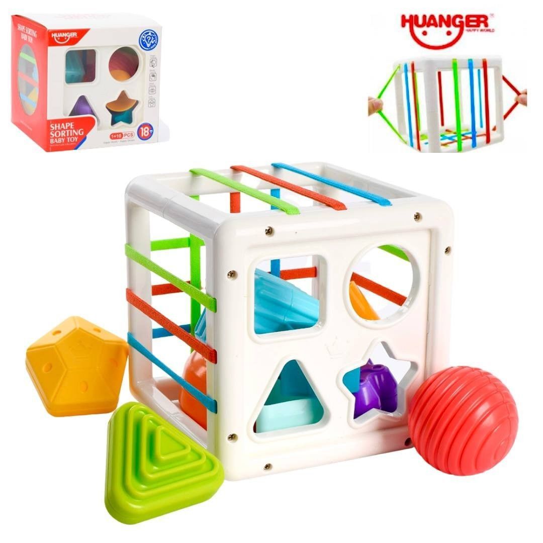 Todos los lados del cubo están cubiertos con bandas de goma, a través de las cuales el bebé debe lanzar la pelota.