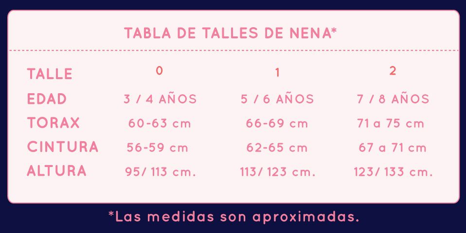 El disfraz viene en 3 talles (ver tabla con medidas)