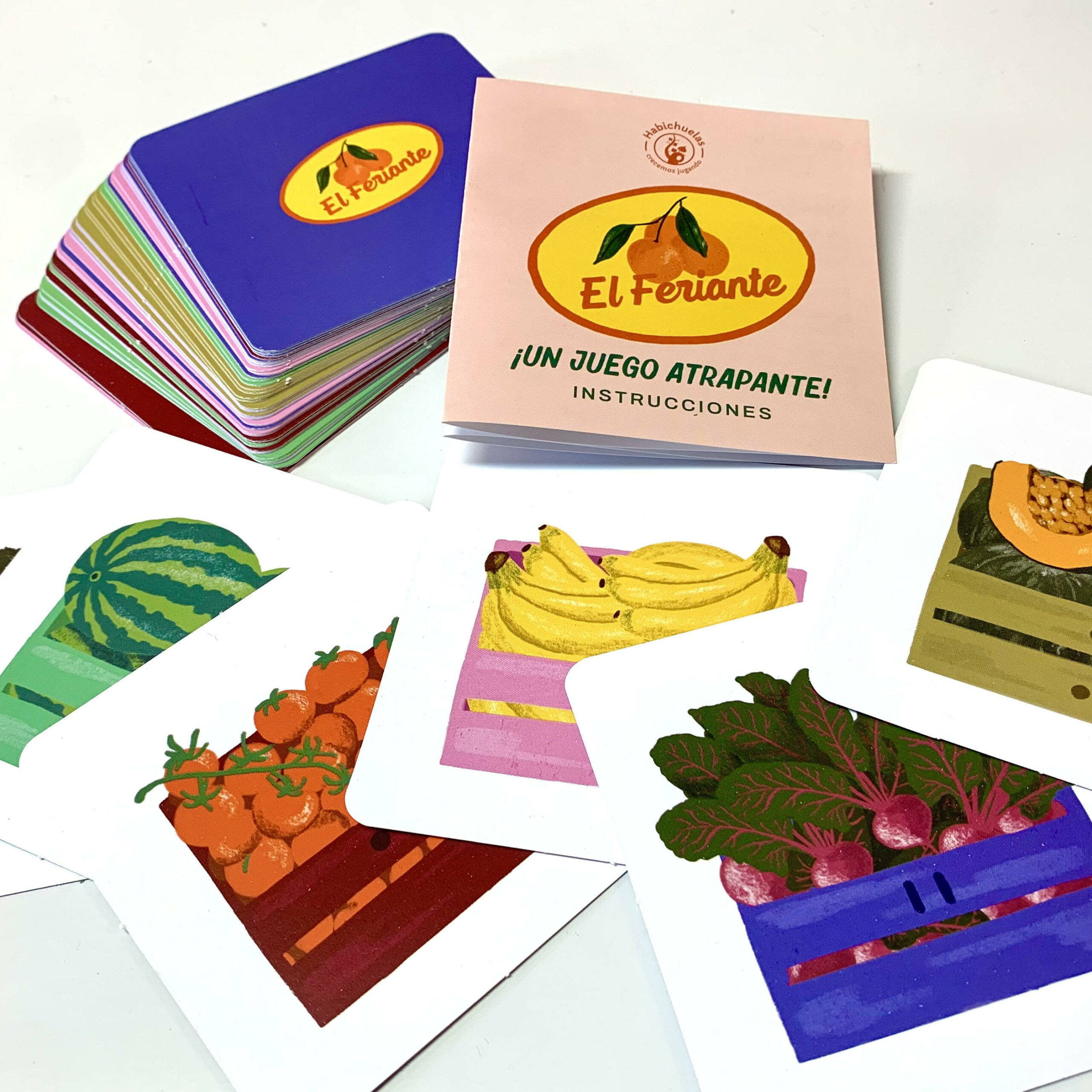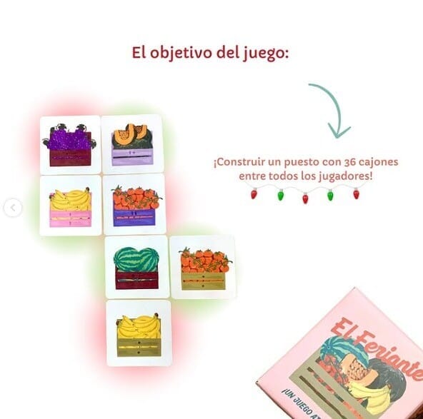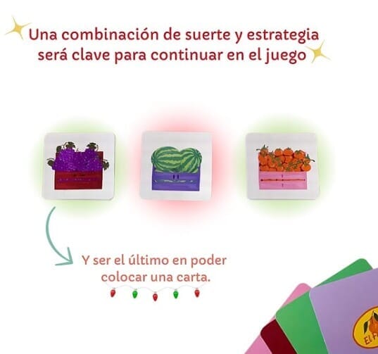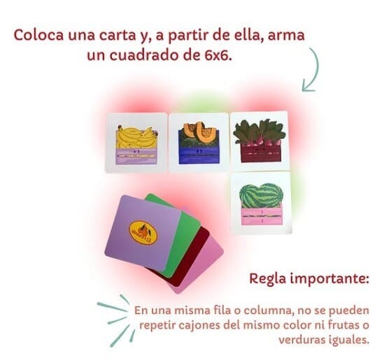 Se puede jugar como solitario, o hasta 4 jugadores. Hay cartas con distintas frutas y verduras y también con distinto color de cajón. Se trata de armar filas o columnas donde no haya repeticiones. Es un juego atrapante