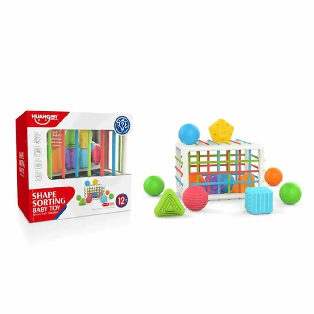 Juguete educativo y de clasificación de formas para bebés que incluye un contenedor sensorial con bandas elásticas de colores y 14 piezas