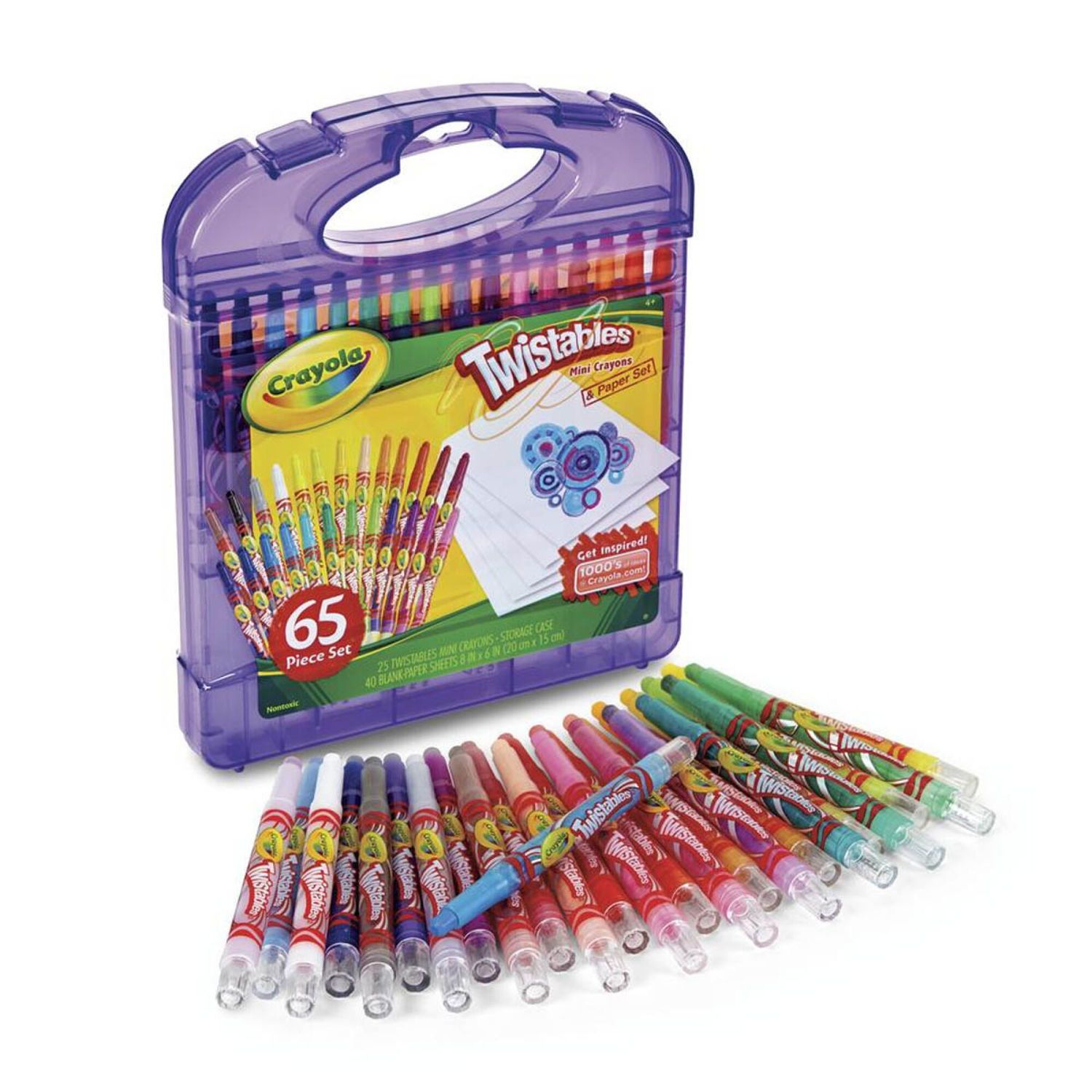 Este juego de crayones de 65 piezas incluye 25 crayones Twistables en miniatura, 40 hojas en blanco y 1 estuche de almacenamiento de viaje.