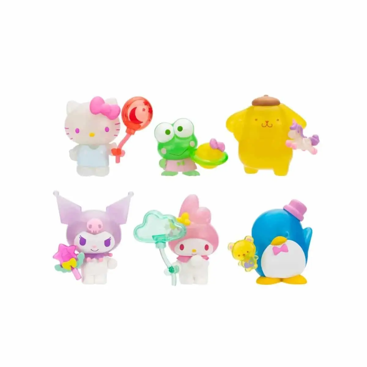 Los detalles incluyen accesorios temáticos únicos para cada personaje, como varitas mágicas, globos y otros objetos pequeños. Este set es ideal para fanáticos de Sanrio, coleccionistas o como decoración para espacios coloridos y alegres.