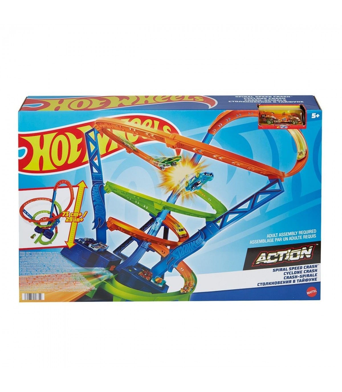 La pista Hot Wheels Action Spiral Speed Crash ofrece grandes emociones con una pista de 74cm de alto, tres zonas de choque y un propulsor motorizado que mantiene al coche en movimiento. Lleva al vehículo Hot Wheels incluido hasta el propulsor y observa cómo recorre continuamente la espiral a toda velocidad. Para aumentar el desafío, añade más coches hasta que se produzca un choque inevitable en una de las zonas de choque. Almacena hasta seis coches sobre el compartimento de la batería y el propulsor. Los coches adicionales se venden por separado. Los colores y la decoración pueden variar.