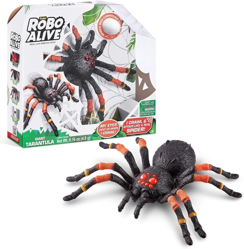 ¡Es la Tarántula Gigante de Robo Alive!!! ¡Este espeluznante bicho usa tecnología de movimiento inteligente para imitar a una araña real! ¡Esconde la araña para dar los mejores sustos! ¡Con luces, los sustos nocturnos son mucho más aterradores con esta gigantesca araña!