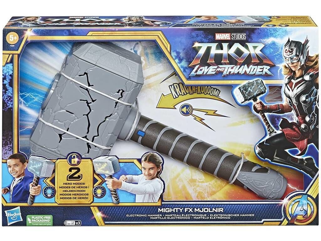 2 Modos de heroelos niños a partir de 5 años pueden imaginarse en aventuras con el poderoso hacha electrónica Mighty FX Mjolnir como Thor o Mighty Thor, con luces y sonidos específicos para cada personaje.